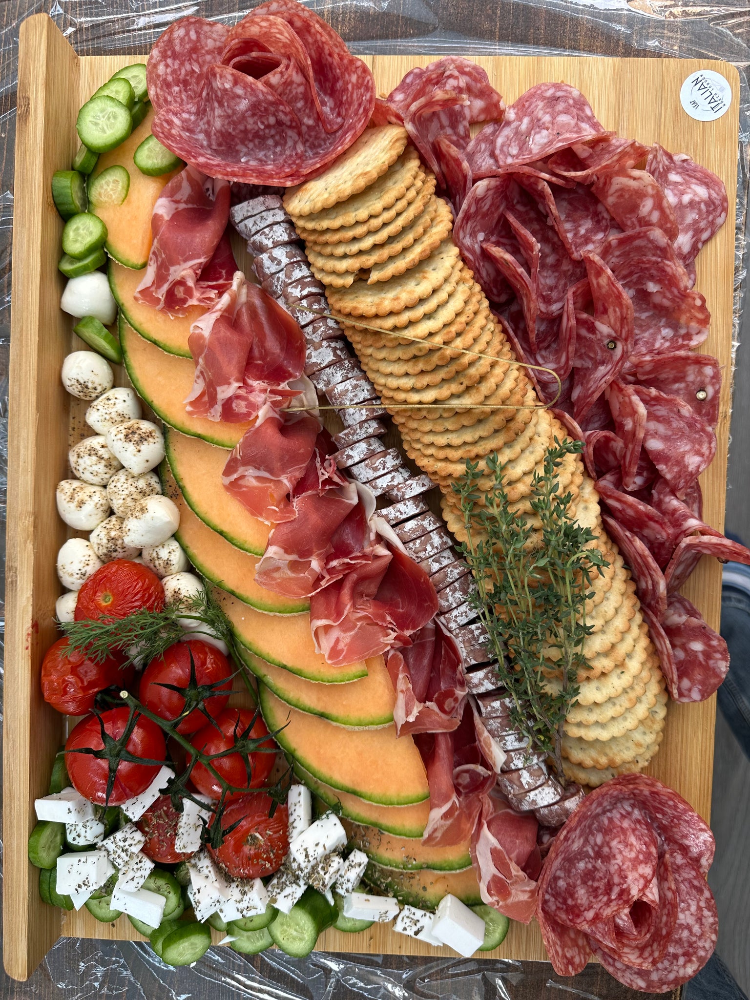 A big cheese board with 4 different cheese or meat, fully customizable, seasonal fruits and nibbles to share with your loved ones. On the side a focaccia tray available in different flavour ( onions in the pic )