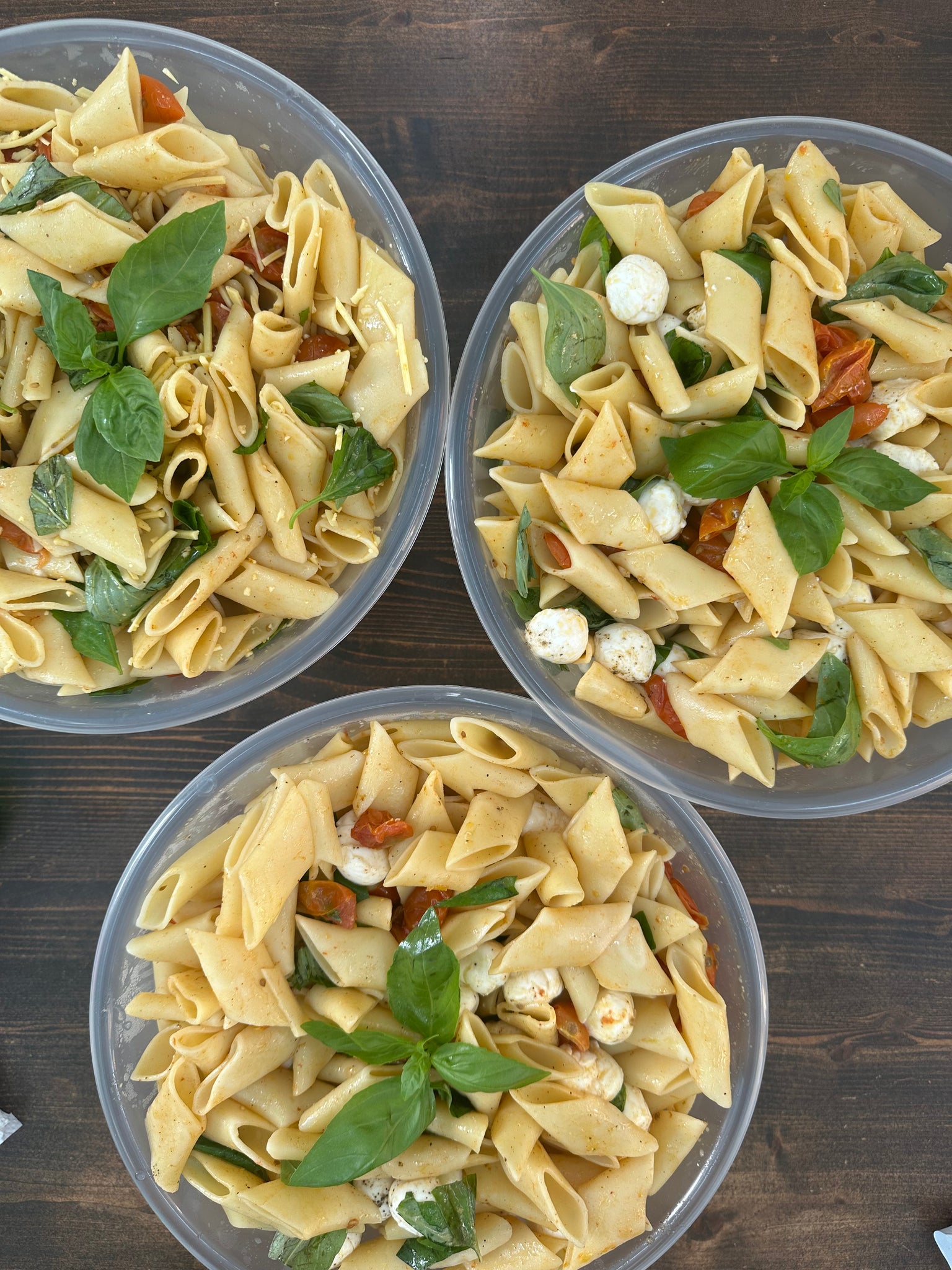 Pasta salad perfect for your catering buffet, fresh and hearty, comes in bowls with dressing extra virgin aromatic oil.
